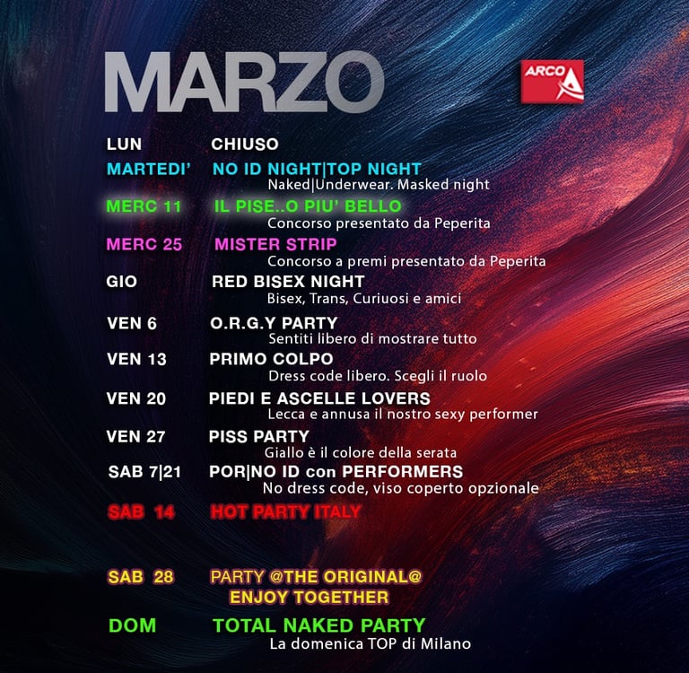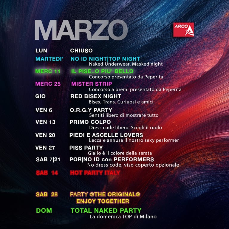 Che tu sia gay, bisex, transex, trav o solo curioso, sei invitato a questa serata folle e bollente. Tutti i generi, tutti i sessi, tutte le voglie confluiscono in questa nottata nel Club più alternativo di Milano. Dominatrix in cerca di schiavi da calpestare, coppie scambiste, ragazzi che sembrano ragazze e donne che vogliono tutto e tutti... ogni cosa è concessa e benvenuta. Lasciati finalmente andare per quello che veramente sei e vuoi, esplora il club in cerca della situazione giusta per te o rimani nella zona bar a bere e fare due chiacchere. In ogni caso sarà un esperienza unica.